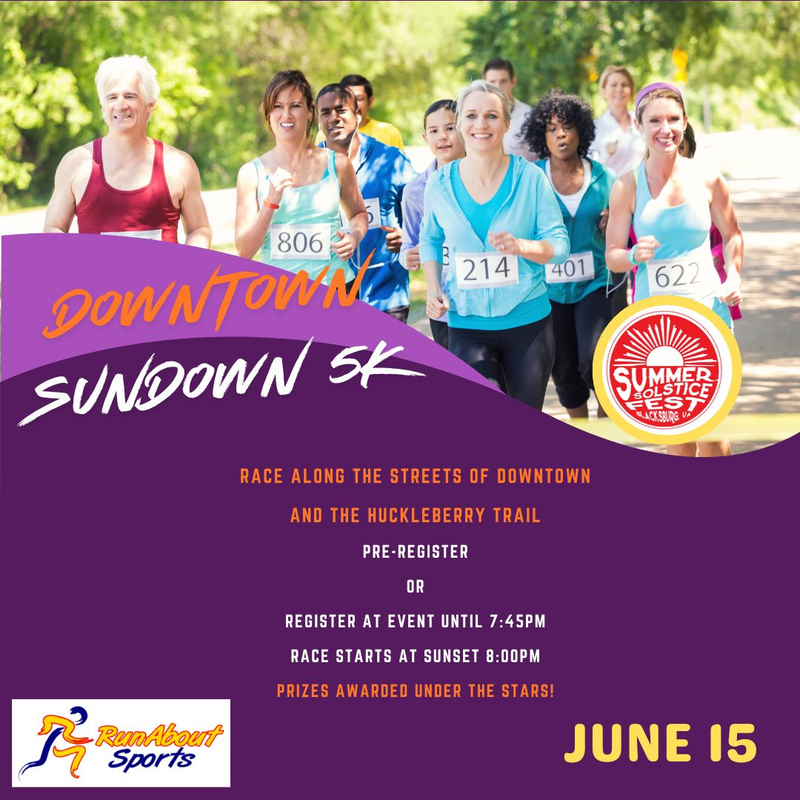 RunAbout Sports presents the 2024 Downtown Sundown 5K® on Saturday, June 15, 2024 in downtown Blacksburg, VA as part of the Summer Solstice Festival.
