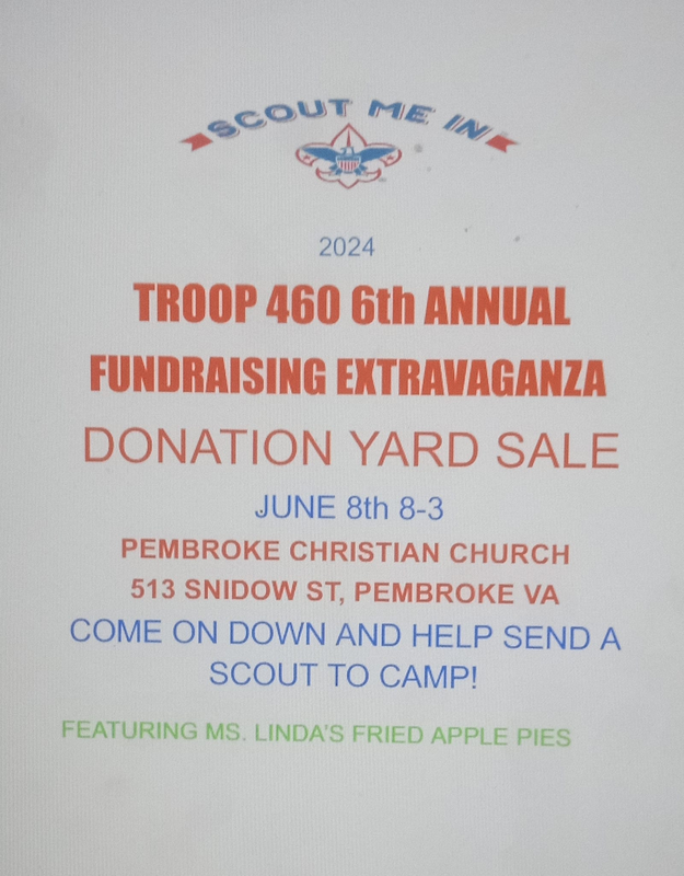 Scout Troop 460 presents their 6th Annual Fundraising Extravaganza and Donation Yard Sale on Saturday, June 8, 2024 at Pembroke Christian Church.