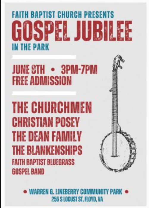 Faith Baptist Church, Floyd, VA presents the Gospel Jubilee In The Park on Saturday, June 8, 2024 at Warren G. Lineberry Memorial Park.