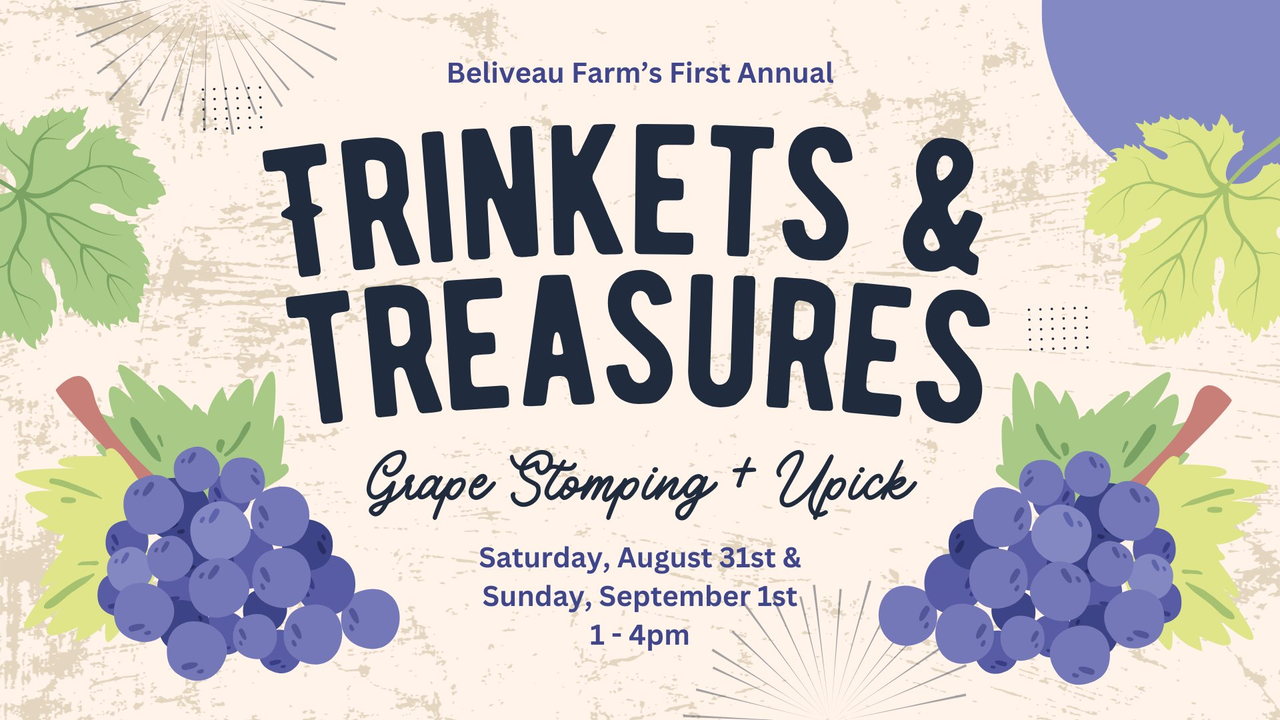 Beliveau Farm Winery presents their "Trinkets & Treasures" Grape Stomping Festival on Saturday, August 31, 2024 and Sunday, September 1, 2024 from 1:00-4:00 PM each day.