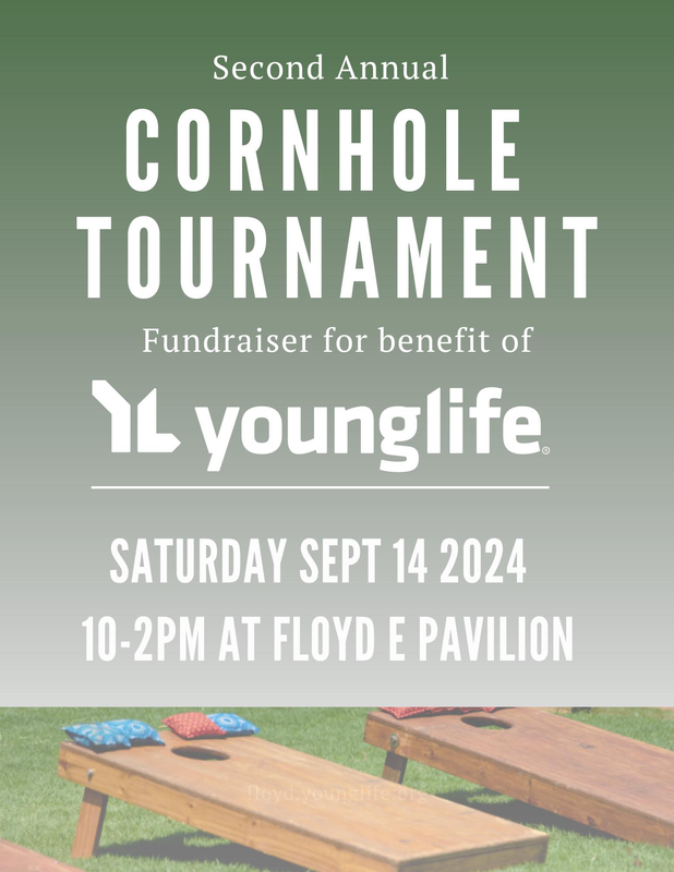 Floyd County Young Life presents the 2nd Annual Cornhole Tournament on Saturday, September 14, 2024 at Floyd Elementary School Pavilion.