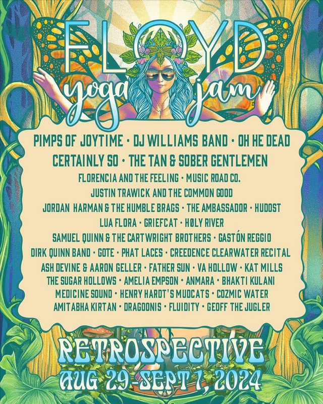 Floyd Yoga Jam brings a carefully curated selection of musical artists with over 30 performers. This year includes soul, funk, jazz, reggae, pop, country, bluegrass and more.