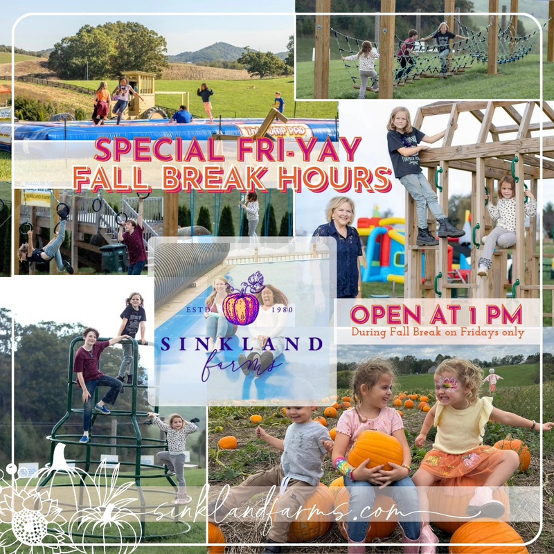 For the Fall Break at local public schools, Sinkland Farms has extended their hours will will open at 1:00 PM on Friday and admission is just $10.00 per person.