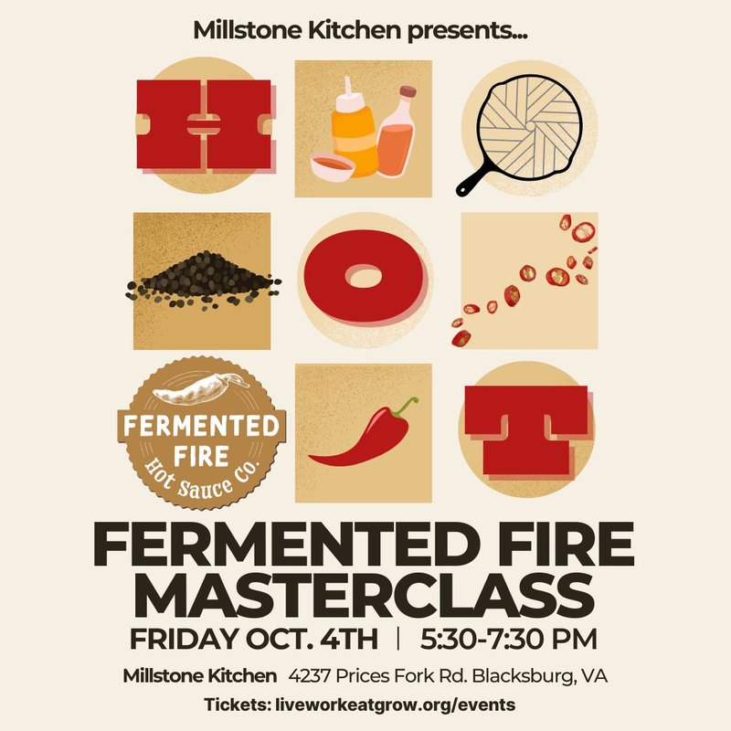 Based in Roanoke, VA, Fermented Fire is ‘lighting up’ the market with their unique approach to small batch fermentation using local ingredients. Participants will receive guided instruction, hands-on processing techniques for utilizing fresh, seasonal produce, and a personal take-home fermentation kit.