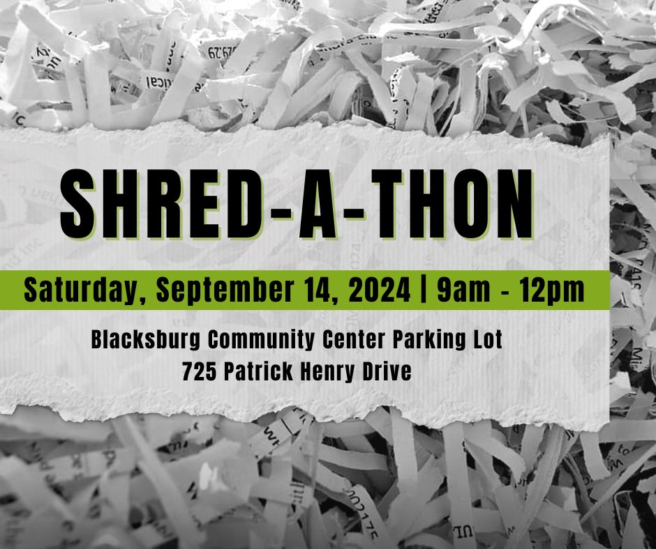 The Town of Blacksburg presents a Drive-Thru Shred-A-Thon on Saturday, September 14, 2024 in the Blacksburg Community Center parking lot.