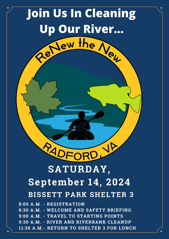 ReNew the New sponsors two annual river clean-ups. In the spring is “Ramps ‘n’ Roads” and in the fall, “Fall Into the New”. Citizens of all ages, from all areas of New River Valley, will be cleaning litter from our highways and byways, boat ramps, river and stream access points. This year you can register to join one of four clean up efforts: Giles, Radford, Montgomery or Floyd. Anyone interested in protecting and renewing the beautiful New River is welcome to join in.