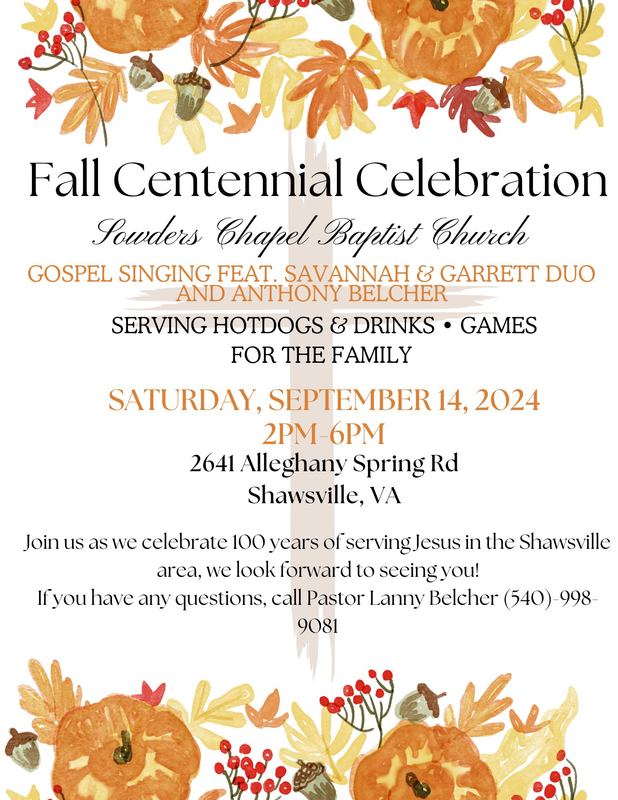 Sowders Chapel Baptist Church presents their Fall Centennial Celebration on Saturday, September 14, 2024.