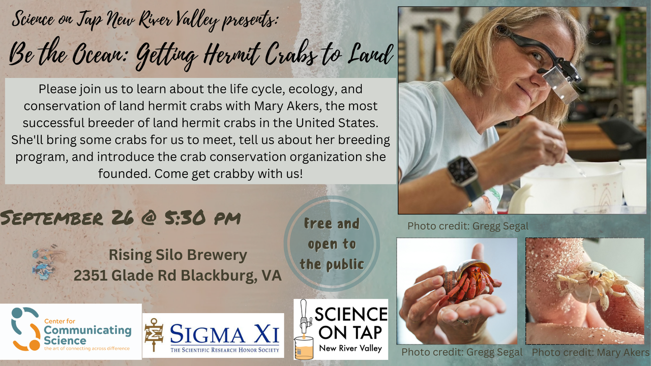 Science on Tap - New River Valley presents their September event titled "Be the Ocean: Getting Hermit Crabs to Land" on Thursday, September 26, 2024 at Rising Silo Farm Brewery.