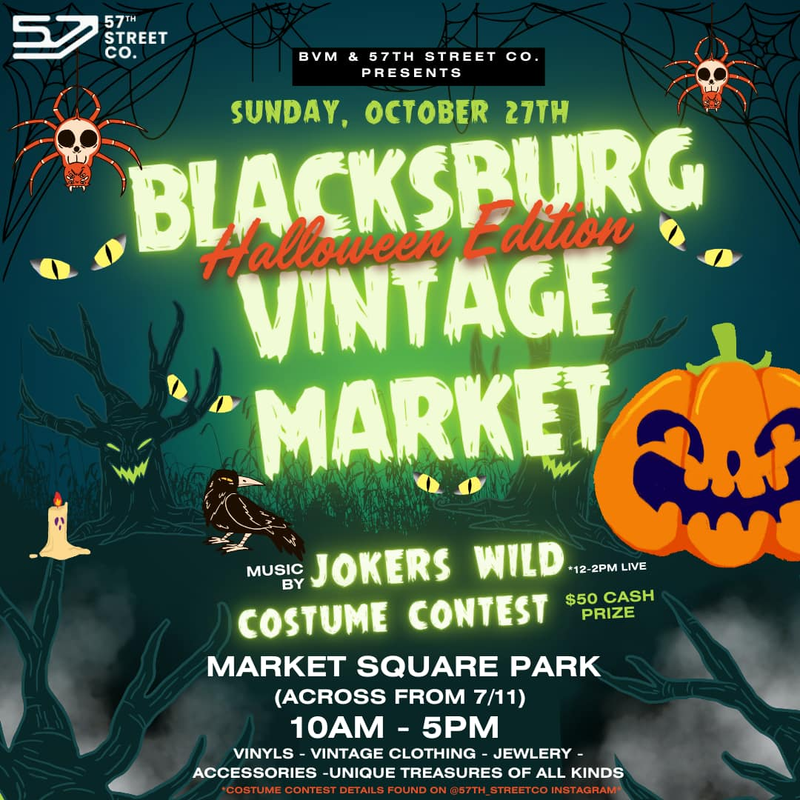 The Blacksburg Vintage Market hosts a special Halloween Edition of the Vintage Market with live music from Jokers Wild on Sunday, October 27, 2024 at Market Square Park in downtown Blacksburg, VA.