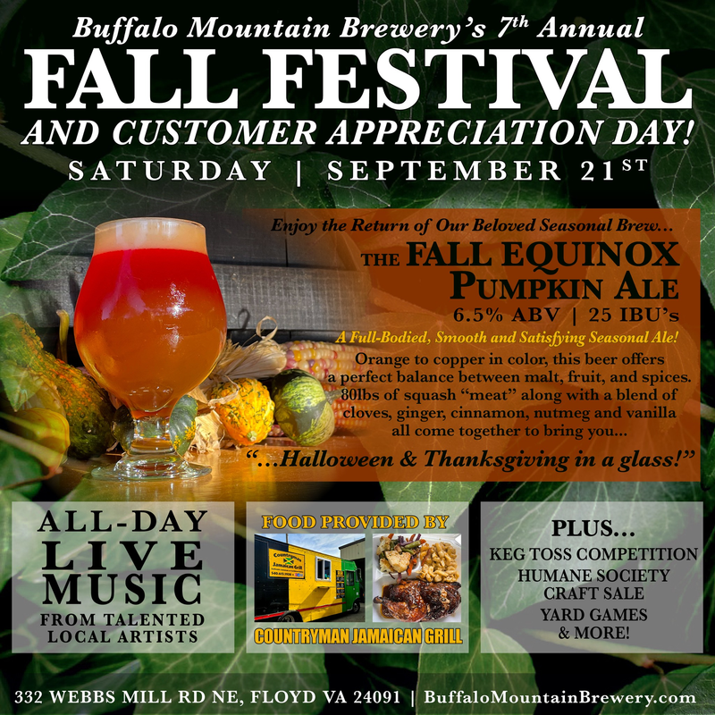 Buffalo Mountain Brewery presents the 7th Annual Fall Festival and Customer Appreciation Day on Saturday, September 21, 2024.