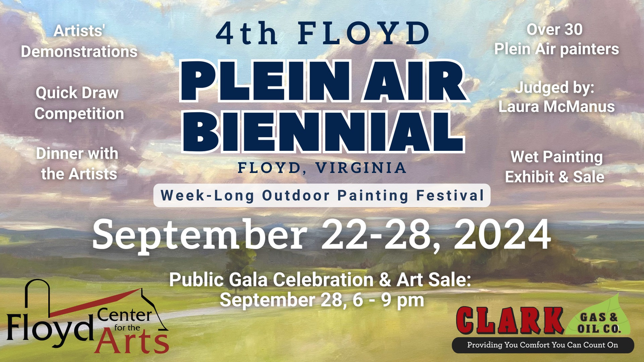 The Floyd Center for the Arts is pleased to announce the 4th Floyd Plein Air Biennial, the week-long outdoor painting festival, to take place at sites in and around Floyd County starting on Sunday, September 22, 2024 through Saturday, September 28, 2024.