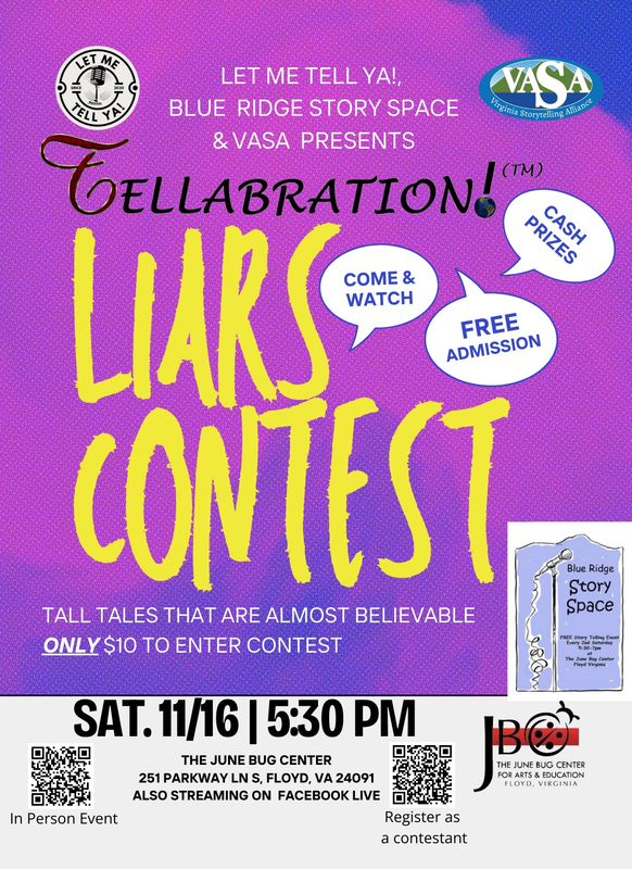 Blue Ridge Story Space, Let Me Tell Ya! and Virginia Storytelling Alumni (VASA) presents "Tellatbration!" Liars Contest on Saturday, November 16, 2024 at The June Bug Center.
