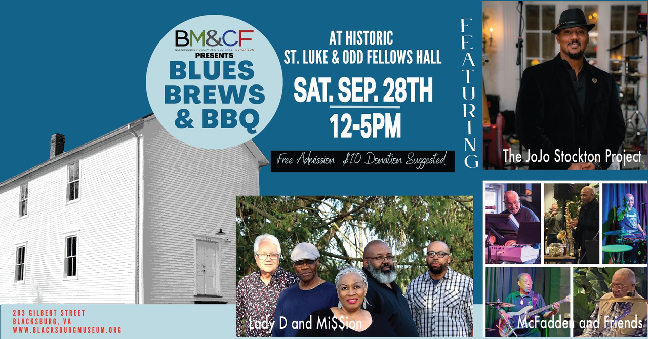 The Blacksburg Museum and Cultural Foundation presents the 10th Annual New Town Festival: Blues, Brews and BBQ on Saturday, October 28, 2023 at St. Luke and Odd Fellows Hall.