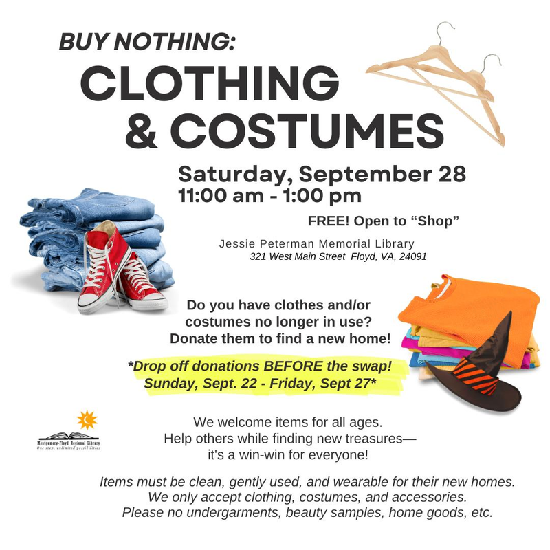 The Jessie Peterman Library presents Buy Nothing: Clothing & Costume Exchange on Saturday, September 28, 2024.