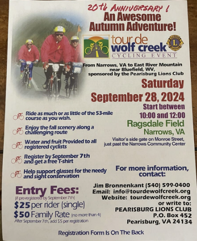 The Pearisburg Lions Club presents the 20th Anniversary of the Tour de Wolf Creek Cycling Event on Saturday, September 28, 2024 starting and ending at Ragsdale Field in Narrows, VA starting anytime between 10:00 AM and 12:00 PM.