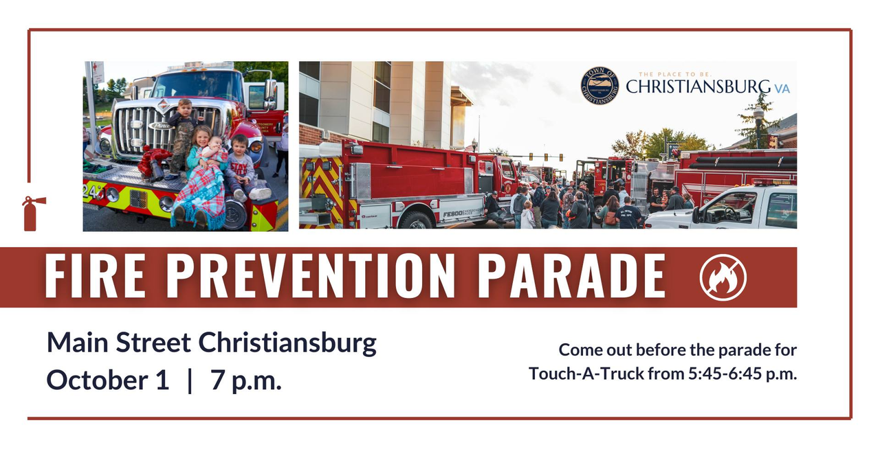 The Christiansburg Volunteer Fire Department and the Town of Christiansburg presents the 20th Annual Fire Prevention Week Parade and Touch-A-Truck on Tuesday, October 1, 2024 in downtown Christiansburg, VA.
