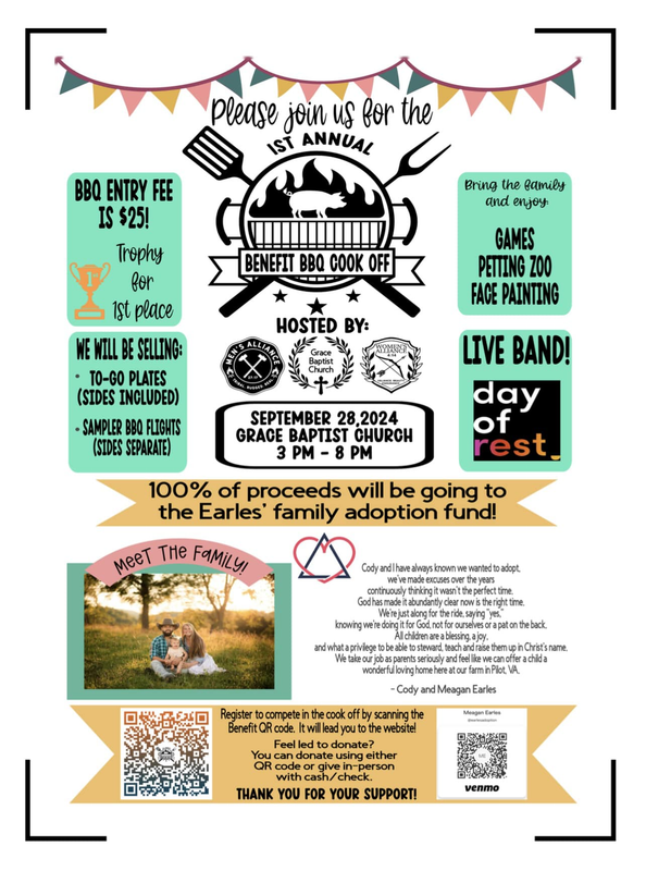 Grace Baptist Church, Men's Alliance Buffalo Tribe and the Woman's Alliance Silver Tribe hosts the 1st Annual Benefit BBQ Cookoff on Saturday, September 28, 2024 at Grace Baptist Church.