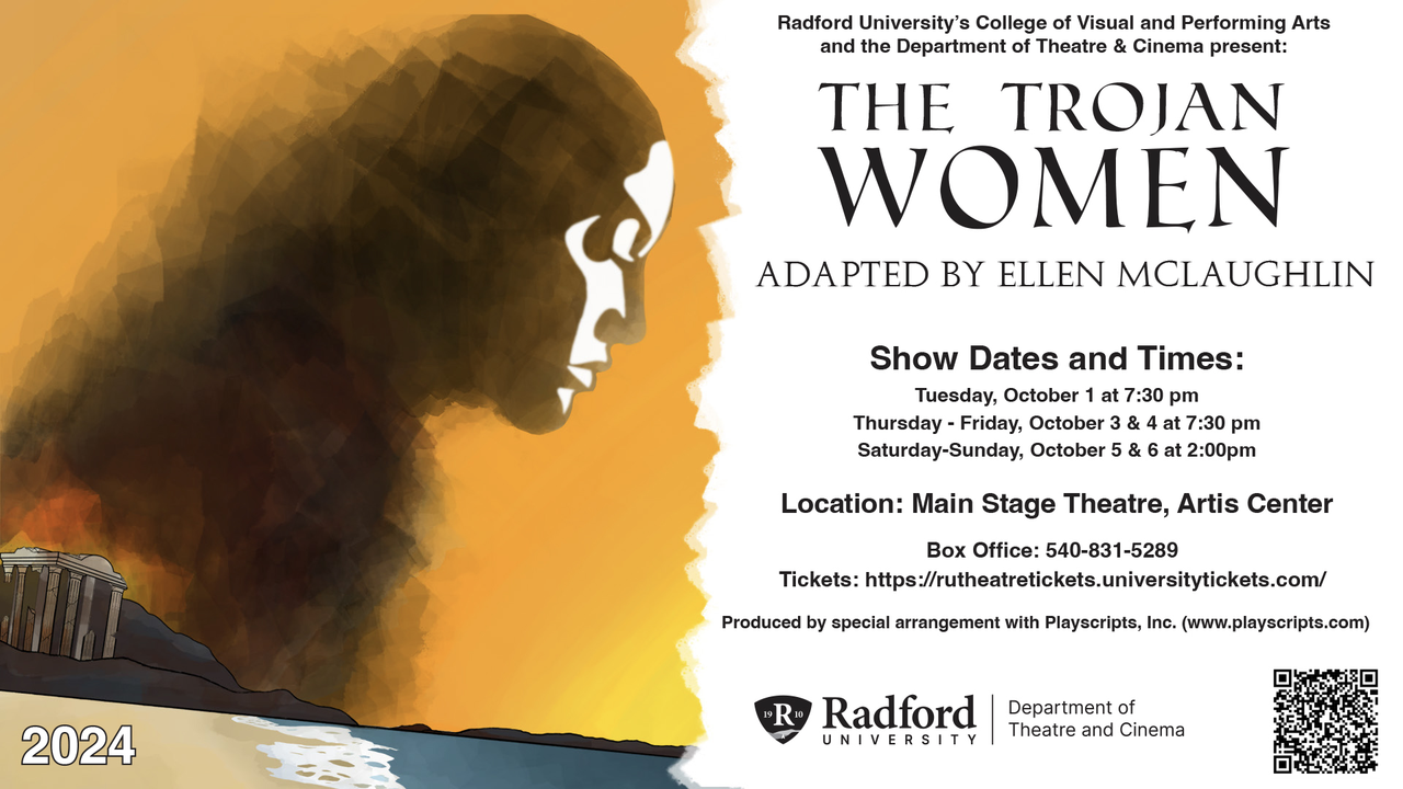 Radford University College of Visual & Performing Arts presents the play "The Trojan Women" with five performances starting on Tuesday, October 1, 2024 and continuing through Sunday, October 6, 2024 inside the Artis Center for Adaptive Innovation and Creativity on the campus of Radford University.