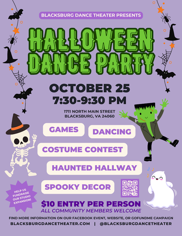 Blacksburg Dance Theater presents a Halloween Dance Party on Friday, October 25, 2024.
