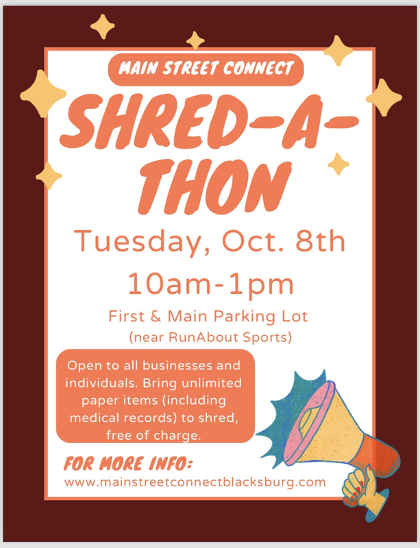 Main Street Connect presents a Shred-a-thon on Tuesday, October 8, 2024 in the First & Main parking lot, close to RunAbout Sports.
