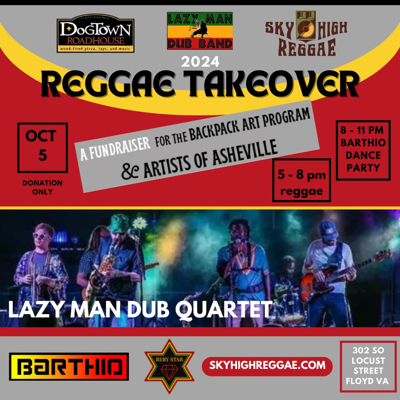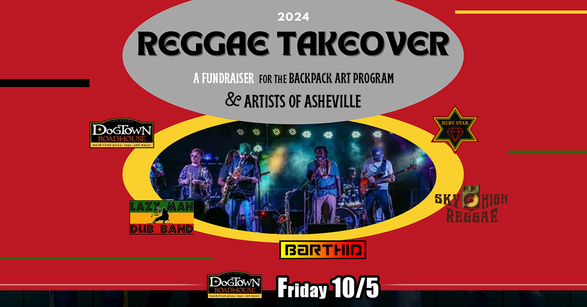 Sky High Reggae and Dogtown Roadhouse presents the Reggae Takeover, A Fundraiser for the Artists of Asheville and Backpack Art Program on Saturday, October 5, 2024.