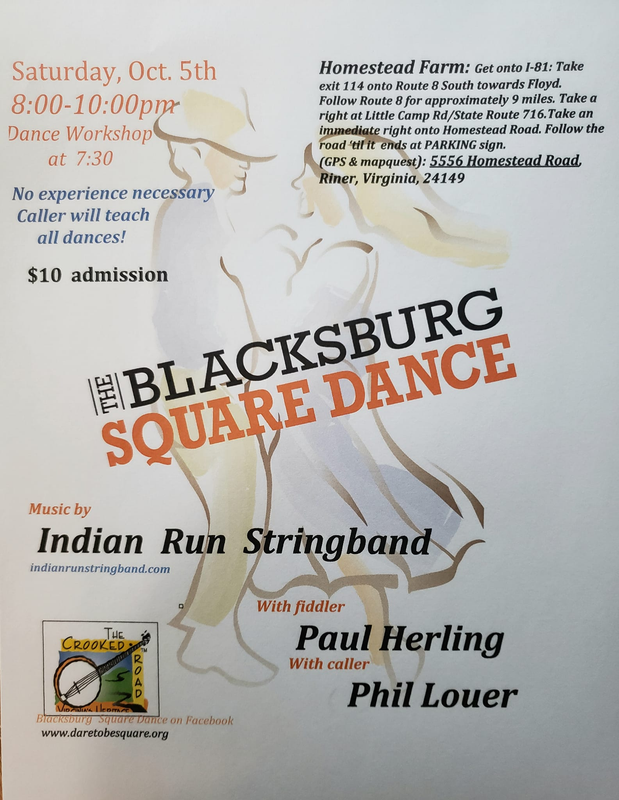 Join us for another Blacksburg Square Dance at Homestead Farm! Music by Indian Run Stringband and dance calling by Phil Louer.