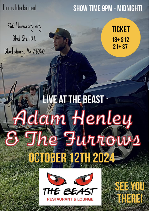 The Beast of Blacksburg Pizzeria & Bar presents Adam Henley & The Furrows in concert on Saturday, October 12, 2024.