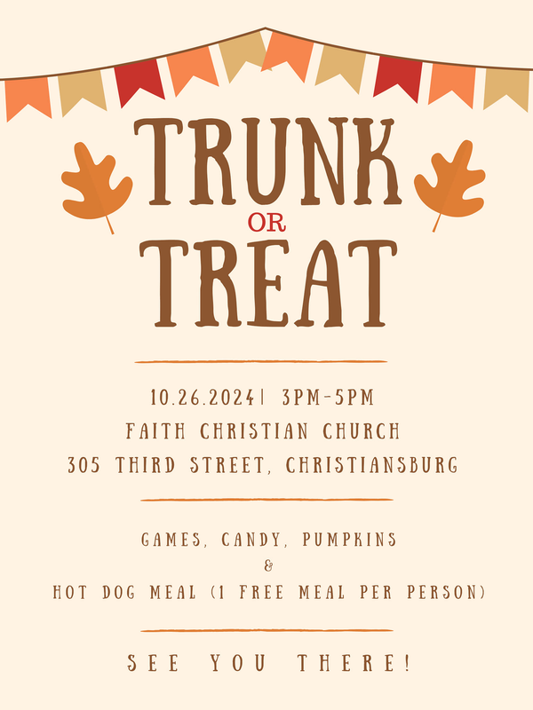 Faith Christian Church presents their 2024 Trunk or Treat on Saturday, October 26, 2024.