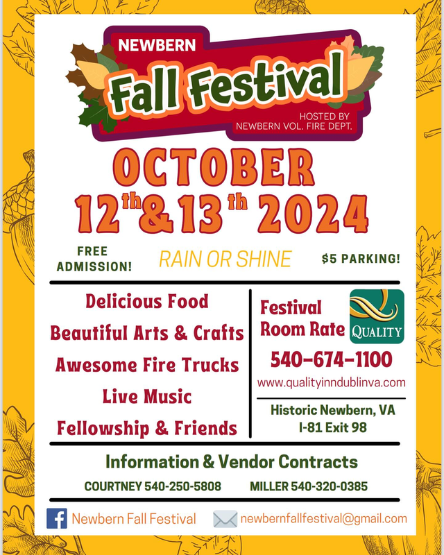 The Newbern Volunteer Fire Department presents the 53rd Annual Newbern Fall Festival on Saturday, October 12, 2024 from 8:00 AM until 5:00 PM and Sunday, October 13, 2024 from 10:00 AM until 4:00 PM in historic downtown Newbern, VA.