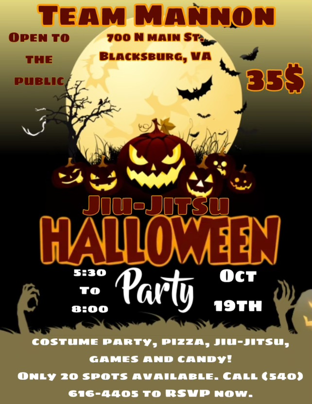 Join the Team Mannon Jiu-Jitsu Halloween Party. Kids are encouraged to wear costumes that accommodate well for jiujitsu though costumes are optional.