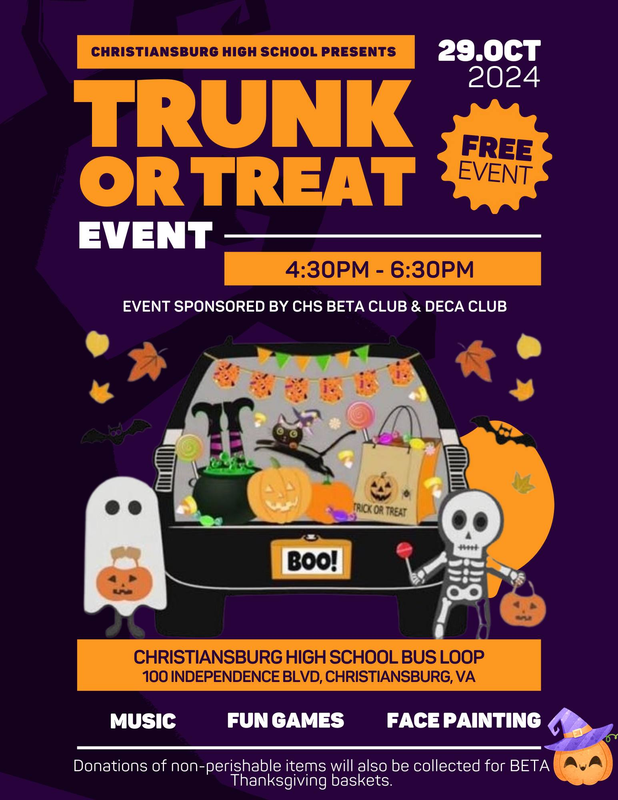 The Christiansburg High School Beta Club and Deca Club presents the Christiansburg High School Trunk or Treat on Tuesday, October 29, 2024 at the Christiansburg High School Bus Loop.