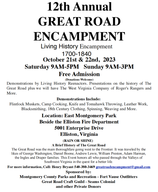 For more information, call Henry Bryant at 540-380-3469 or email greatroadencampment@gmail.com or visit: