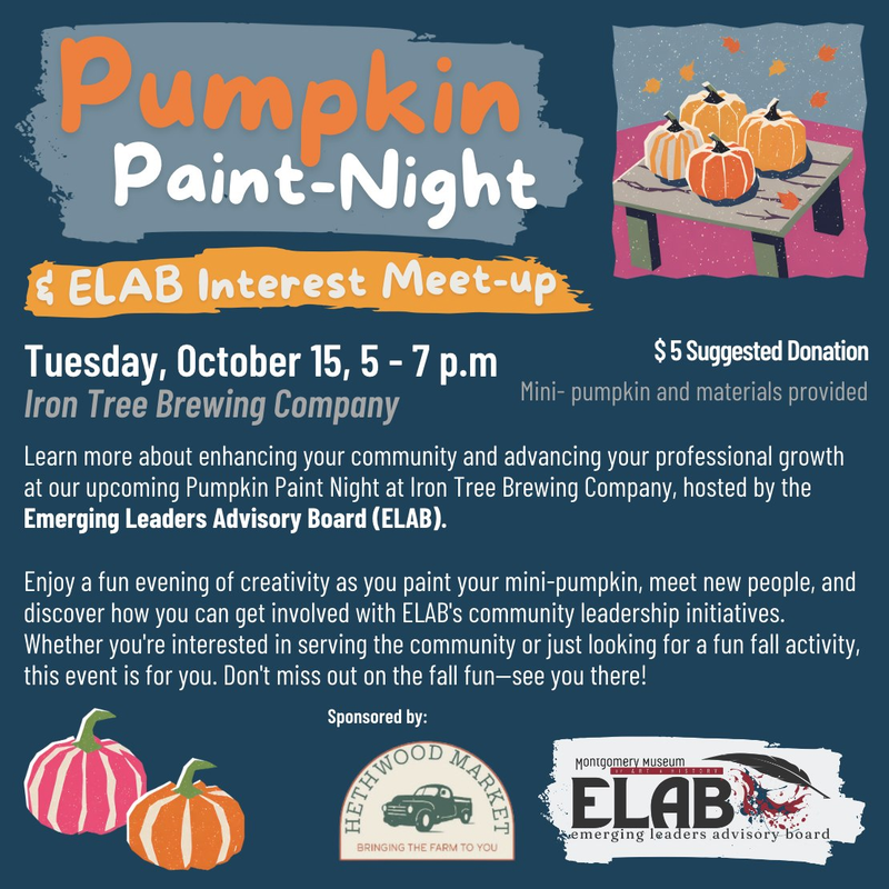 Montgomery Museum's Emerging Leaders Advisory Board (ELAB) presents a Pumpkin Paint-Night & ELAB Interest Meet-Up on Tuesday, October 15, 2024 at Iron Tree Brewing Company in Christiansburg, VA.