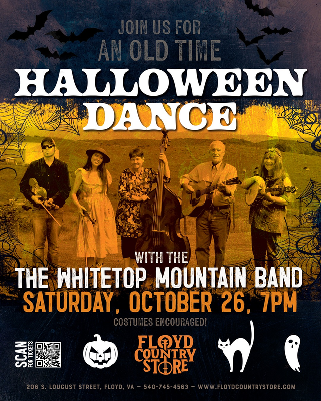The Floyd Country Store presents their annual Old Time Halloween Dance Party with The Whitetop Mountain Band and Costume Contest on Saturday, October 26, 2024.