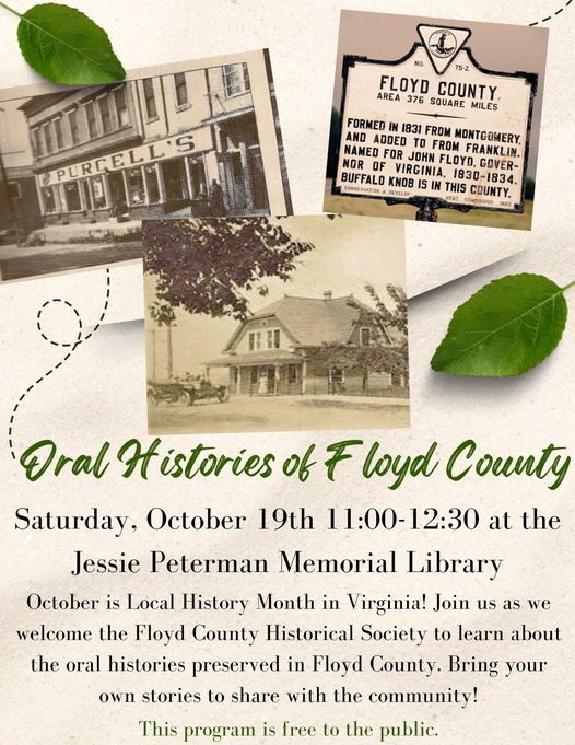 The Jessie Peterman Library presents Oral Histories of Floyd County: Past and Present on Saturday, October 19, 2024.
