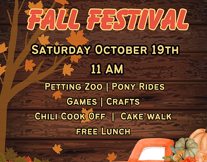 Join us for our annual Fall Festival including a petting zoo, pony rides, game, crafts, chili cook off, cake walk and a free lunch!
