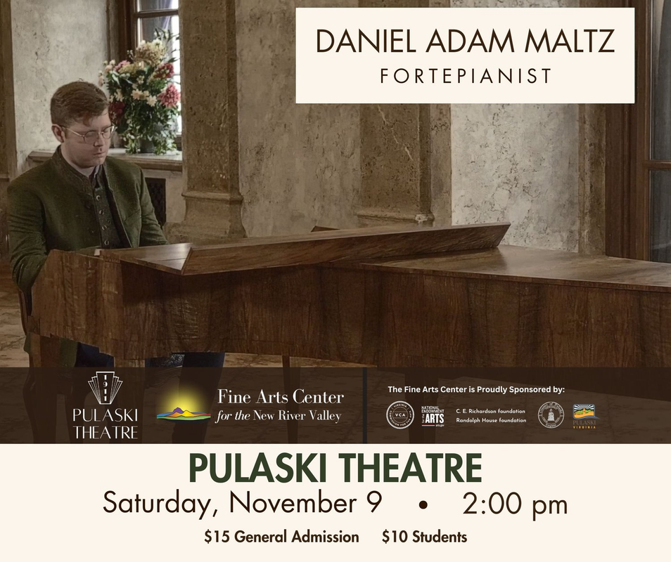 The Fine Arts Center for the New River Valley and the Pulaski Theatre are pleased to present Vienna-based Daniel Adam Maltz performing on a 1792 Viennese fortepiano, the early piano as Mozart and Beethoven knew it, on Saturday, November 9, 2024 at the historic Pulaski Theatre.