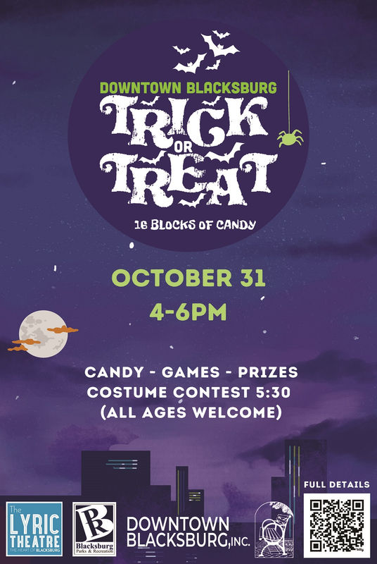 • 4:00-6:00 PM: Trick or Treating at Participating Downtown Blacksburg Merchants
