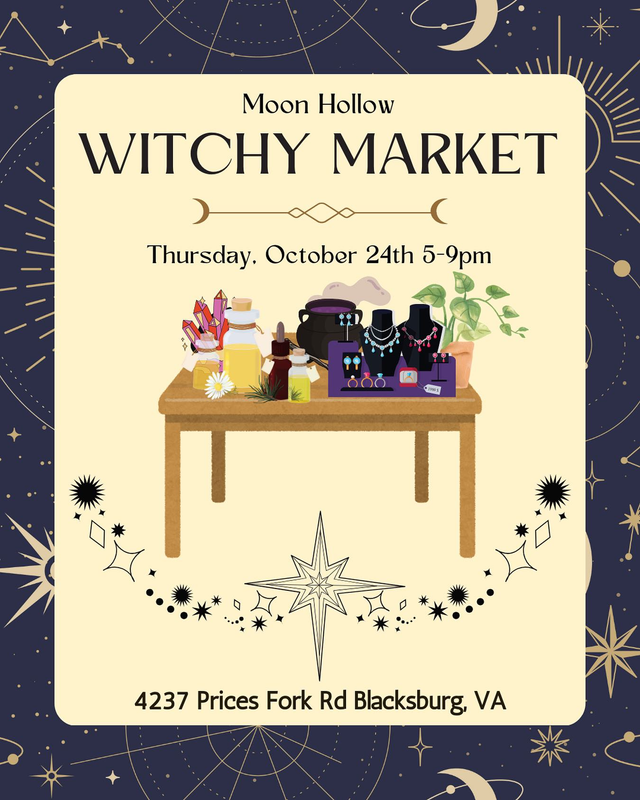 Join us for a spellbinding evening at the Moon Hollow Witchy Market. Shop local vendors for all sorts of magical treasures and indulge in specialty potions (beverages) made by us.