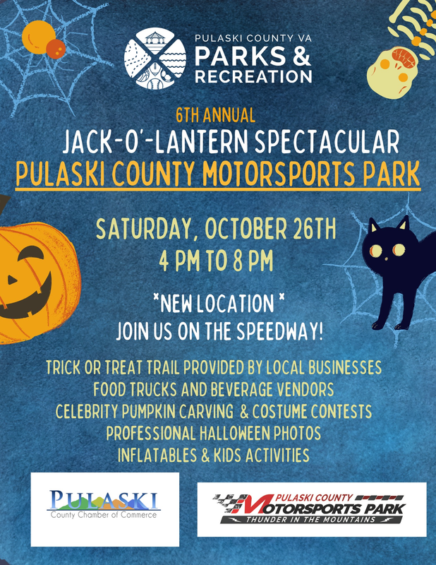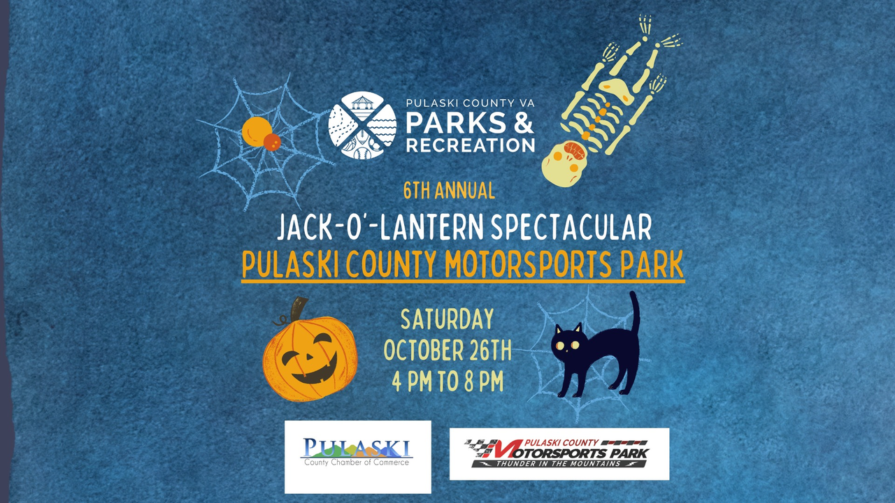 The Pulaski County Chamber of Commerce and the Pulaski County Parks & Recreation present the 6th Annual Jack-O'-Lantern Spectacular on Saturday, October 26, 2024 at Pulaski County Motorsports Park in Dublin, VA.