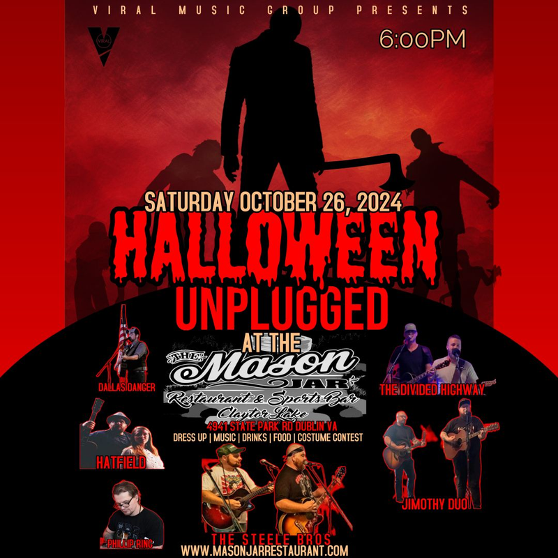 The Mason Jar at Claytor Lake presents Halloween Unplugged with six bands performing and a Halloween Costume Contest on Saturday, October 26, 2024.