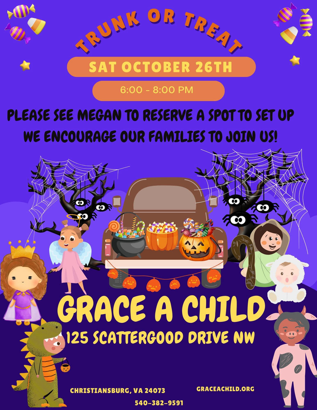 Scattergood Church and Grace-a-Child USA - Christiansburg Academy presents their 2024 Trunk or Treat on Saturday, October 26, 2024 at Grace-a-Child in Christiansburg, VA.