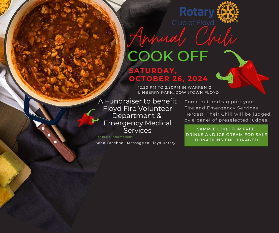 The Rotary Club of Floyd County presents their Annual Chili Cookoff on Saturday, October 26, 2024 outside at the Warren G. Lineberry Memorial Park.