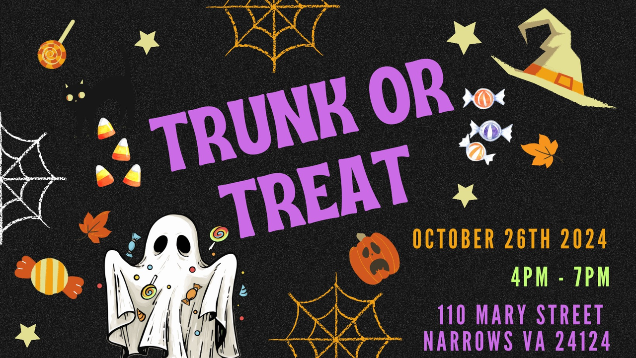 The Town of Narrows presents the Annual Narrows Trunk or Treat on Saturday, October 26, 2024 near the Narrows Community Center outside in the field across from the Duck Pond.