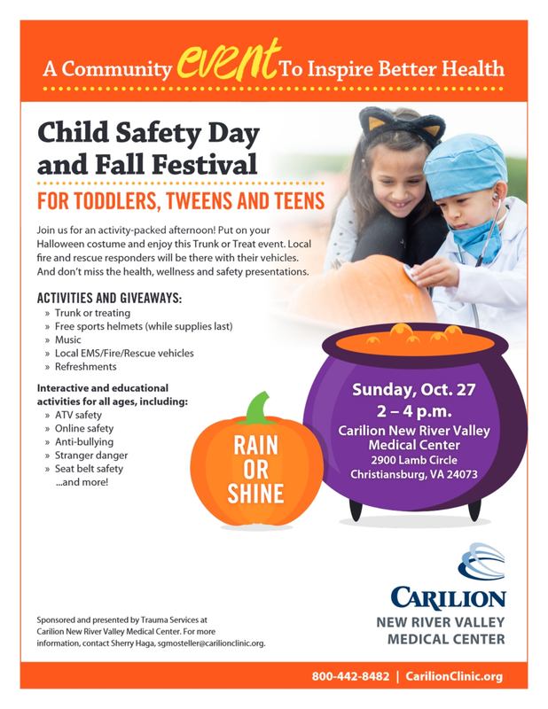 Carilion New River Valley Medical Center presents the 2024 Child Safety Day and Fall Festival for Toddlers, Tweens and Teens on Sunday, October 27, 2024.