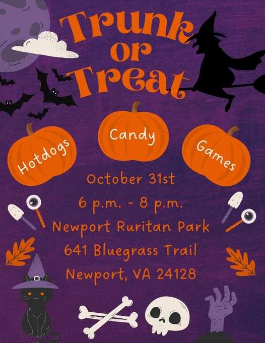Enjoy hot dogs, candy and games! Kids games will be offered at the picnic shelter near the new playground. Support Newport Sports Trunk or Treat.