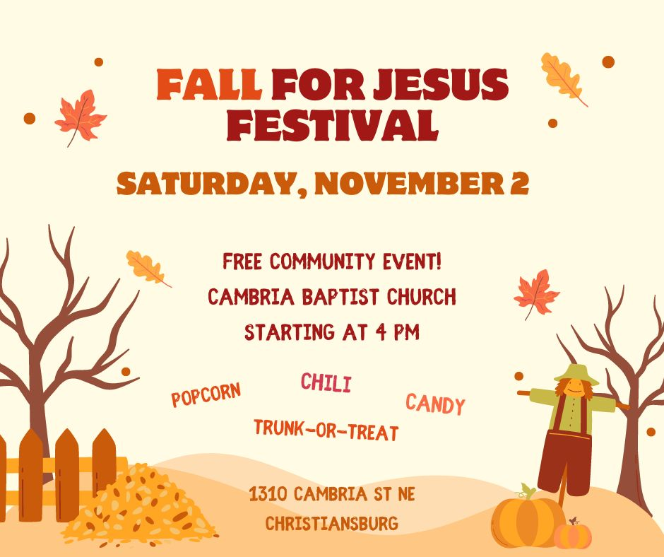 Cambria Baptist Church presents their "Fall" for Jesus Festival on Saturday, November 2, 2024.