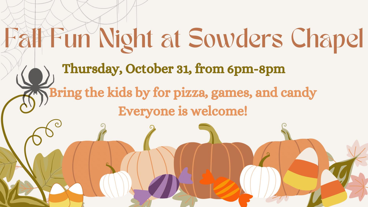 Sowders Chapel Baptist Church presents their Fall Fun Night on Thursday, October 31, 2024.