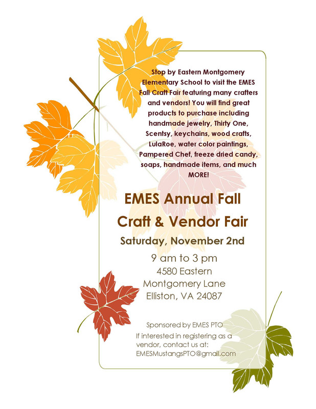 Eastern Montgomery Elementary School (EMES) PTO presents their 11th Annual Fall Craft & Vendor Fair on Saturday, November 2, 2024.