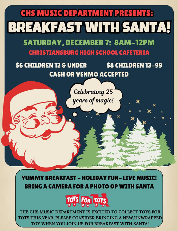 The Christiansburg High School Music Department presents their 25th Annual Breakfast with Santa on Saturday, December 7, 2024 at Christiansburg High School inside the Christiansburg High Cafeteria.